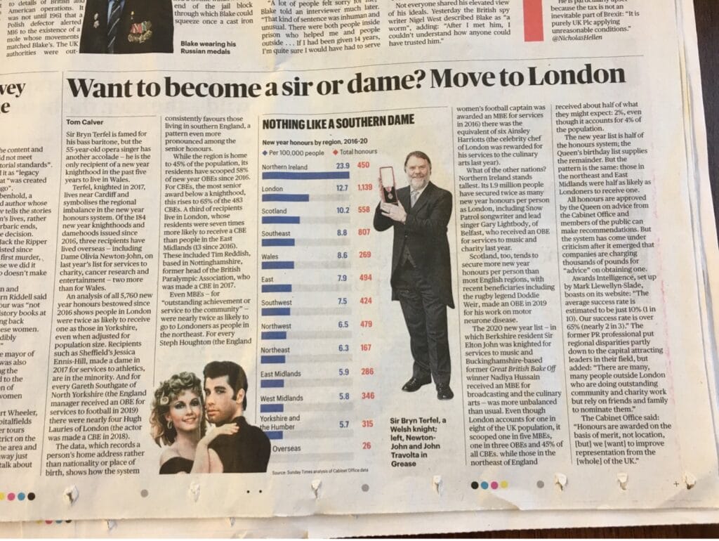 There are considerable regional imbalances and have been for many years, Yorkshire and Humber having the lowest proportion of people with an honour in England according to the latest data I’ve seen.